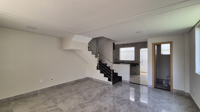 No primeiro pavimento, a sala é ampla e permite dois ambientes, com rebaixamento em gesso que adiciona sofisticação ao espaço. A cozinha, em estilo americana, é integrada e conta com bancadas em granito e cuba em inox, oferecendo funcionalidade e elegância. Um lavabo com acabamento refinado completa o ambiente interno, enquanto a área externa privativa inclui espaço coberto para lavanderia e uma área livre ideal para a criação de um espaço gourmet.